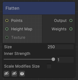 If a texture is assigned, it will use that as a mask for where to flatten. The texture should be a normalized height map (from 0 to 1). Otherwise, a circle of Size per radious will be used to define where to flatten. Use Inner Strenght to smoothen the transition of that circle.